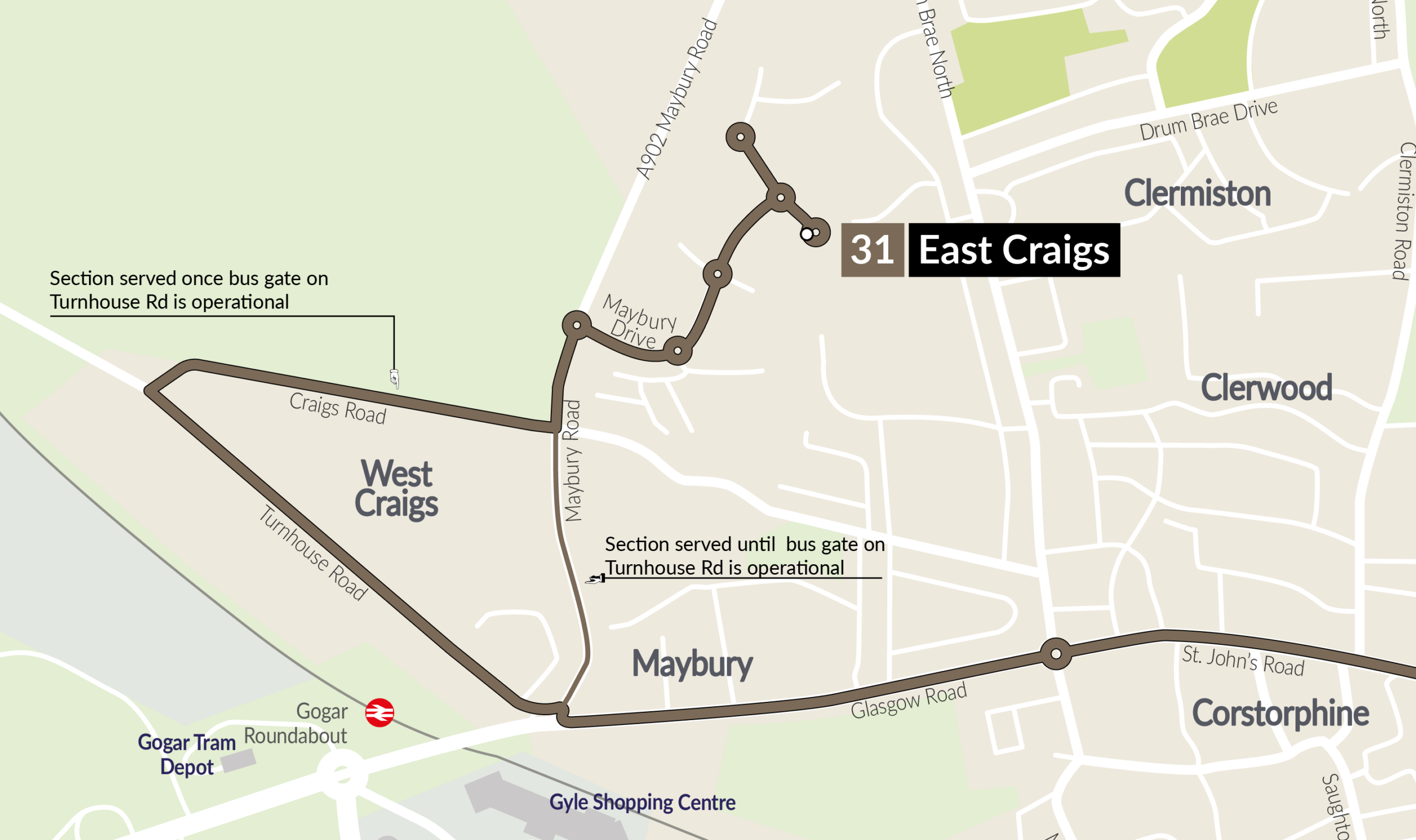 - To Corstorphine Road – Services 12, 26, 31, X18 and X19.