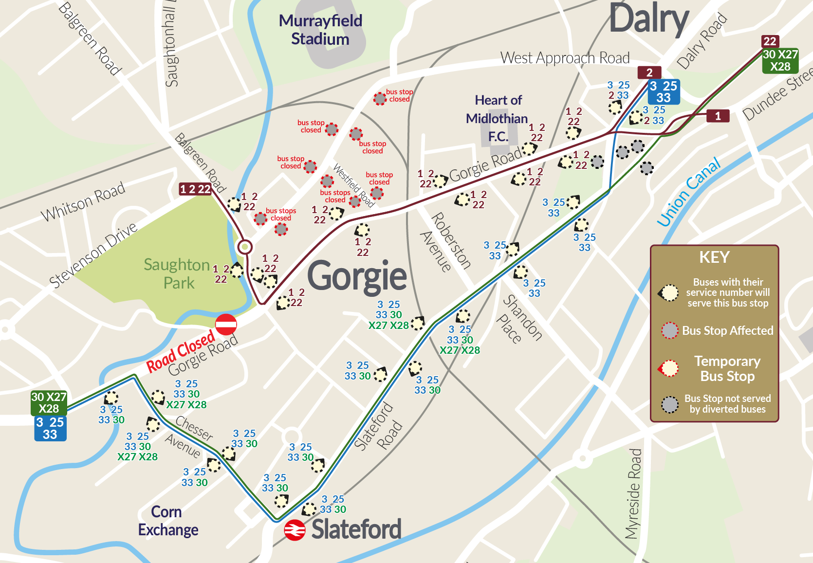Services 3, 25 & 33 – between Gorgie Road and Dalry Road, buses will be diverted via Chesser Avenue, Slateford Road and Ardmillian Terrace in both directions.