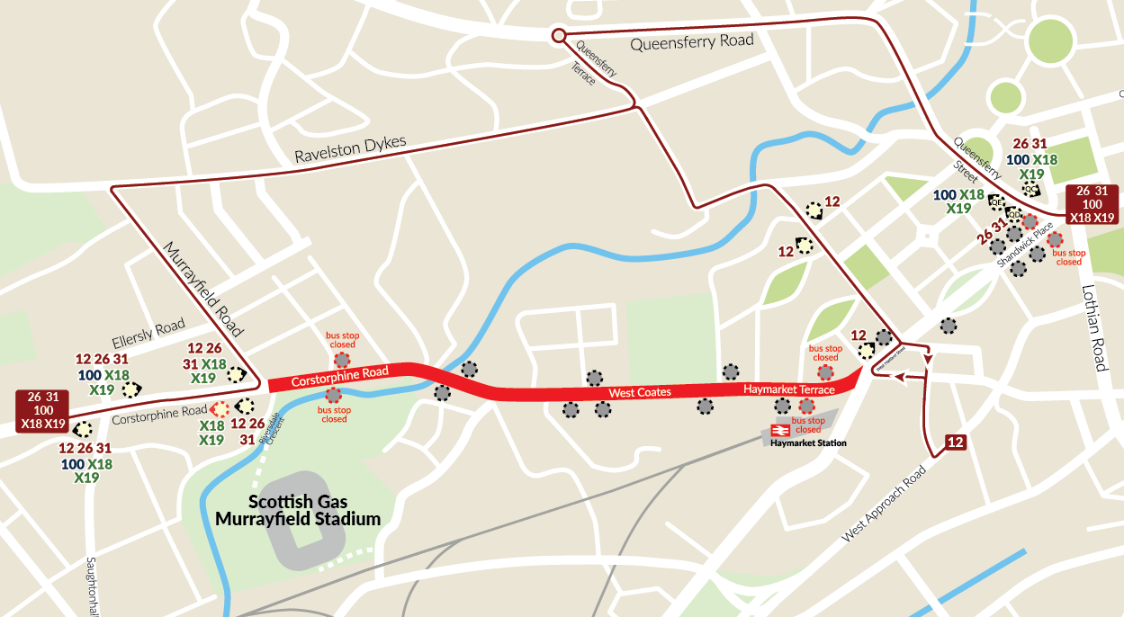 Services 26, 31, 100, X18 & X19 – between Princes Street and Corstorphine Road, buses will be diverted via Queensferry Street, Queensferry Road, Queensferry Terrace, Ravelston Dykes and Murrayfield Road in both directions.